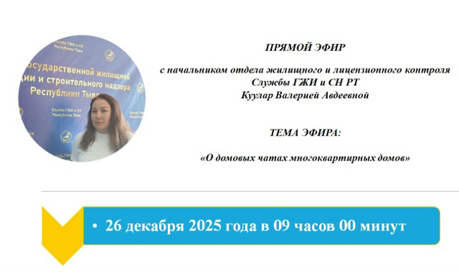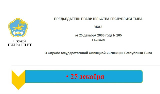 19 лет назад Указом Председателя Правительства Республики Тыва Ш.Д. Ооржака от 25.12.2006 года № 205 была образована Служба государственной жилищной инспекции Республики Тыва.
